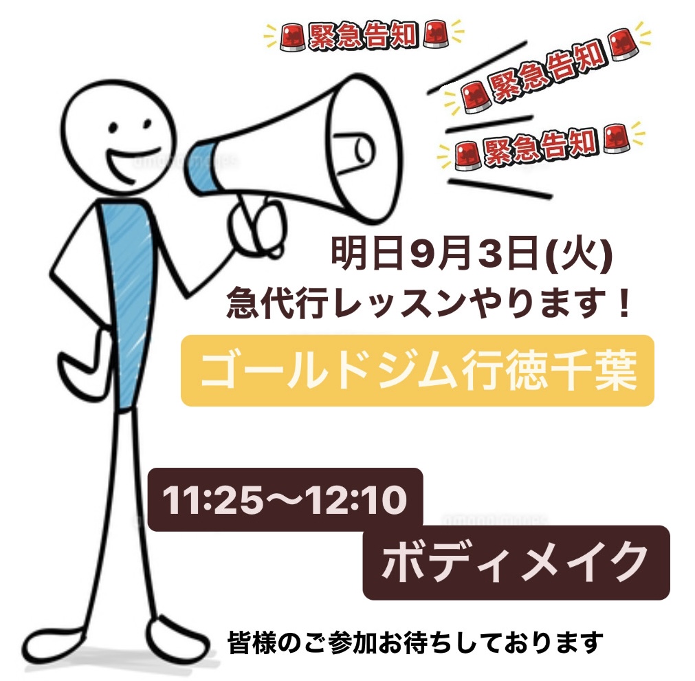 明日9月3日(火)急代行レッスンやります! 2024/9/2 お知らせ, インストラクター, レッスン 明日9月3日火曜日 ゴールドジム行徳千葉で 急代行レッスンやります! 11:25〜12:10 ボディメイク 9ヶ月ぶりにこちらでレッスンやります! 皆様のご参加お待ちしております。