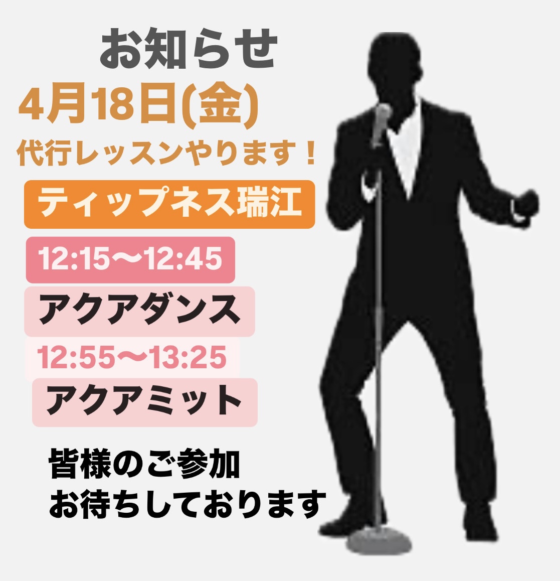 4月18日(金)代行レッスンやります! 2025/4/7 お知らせ, インストラクター, レッスン 4月18日金曜日 ティップネス瑞江で代行レッスンやります! 12:15〜12:45 アクアダンス30 12:55〜13:25 アクアミット30 またまたこの時間の代行やります! 皆様のご参加お待ちしております。
